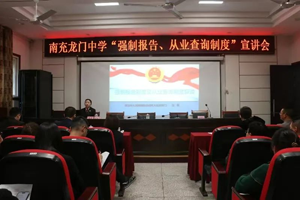 为扎实推进学校未成年人保护工作,增强全体教职员工、临聘人员的法治观念,营造良好的法治校园氛围,助力法治校园建设,31日下午,南充市人民检察院党组副书记、常务副检察长、学校法治副校长唐蔚和市检察院第七检察部主任张莉带领法治宣讲团走进四川省南充龙门中学,为全校工作人员宣讲强制报告与从业查询制度。宣讲会由学校工会主席万彩霞主持。