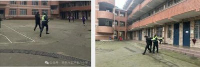 演练模拟了一名不法分子(学校老师假扮)闯入校园,在门卫的询问下,暴露了身份,然后手持凶器强行闯入校园,门卫一边组织力量对抗歹徒一边立马启动一键报警,赵校长同时向全校师生发出预警信号。全校师生听到预警信号后迅速回到教室,在老师的安排下关好门窗,身强力壮的学生堵好教室门。同时安保人员迅速到位,通过短短几分钟时间便将不法分子制服并押走,警报随之解除,学校很快恢复了正常地教学秩序,演练活动圆满结束。
