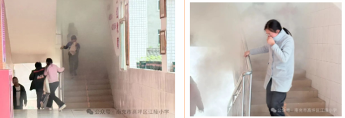 消防警报响起后,疏散演练启动。师生按所学技巧,用湿毛巾捂口鼻、弯腰低姿,在教师引导下沿指定路线撤离至操场。全程无拥挤,数分钟内完成安全集结,检验了应急预案有效性。
