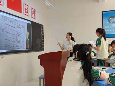 工作室青年成员简丽芳老师精心挑选了毛泽东的四首诗词,带着学生采用“听-读-析”的教学,为大家展示了诗词赏析的方法。课中她营造浓厚的情感氛围,采用多样化的诵读方式,让学生在诵读中感受毛泽东诗词的磅礴气势和革命情怀,实现了语文教学与课程思政的有效融合。