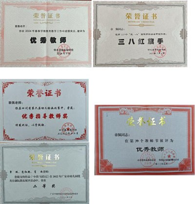 这些年,章佩拿了不少奖:四川省第六届幼儿绘画比赛优秀指导教师、广安市幼儿园优秀自制教玩具展评活动二等奖、邻水县教师技能竞赛自制教玩具一等奖、多次荣获金鼎实验学校“三八红旗手”、“优秀教师”…但她总说:“这些奖不重要,重要的是家长说‘把孩子放在这儿我放心’,是孩子扑过来喊‘章妈妈’,这才是最值钱的奖励。”