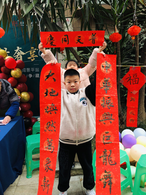 活动现场红红火火、暖意融融。书法老师及少年儿童书法爱好者挥毫泼墨,开笔送“福”,为现场的百姓带来了一份美好的新年祝愿。“中华振兴巨龙舞,大地焕然万象新”“人和家顺百事兴,富贵平安福满堂”“迎喜迎春迎富贵,接财接福接平安”……书法老师和少年儿童以饱满的热情,挥毫泼墨,写下了一幅幅寓意喜庆吉祥、歌颂幸福生活、寄托新春祝福的春联。