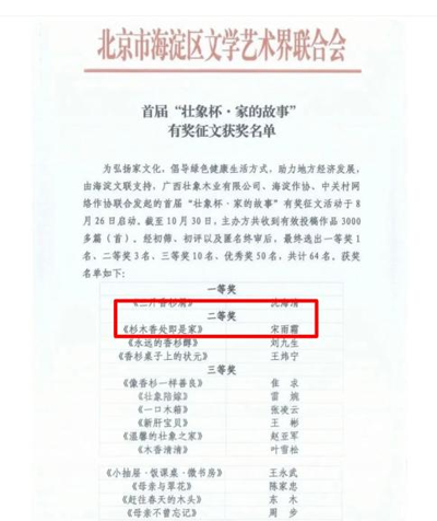 为弘扬家文化,倡导绿色健康生活方式,助力地方经济发展,由海淀区文联支持,广西壮象木业有限公司、海淀作协、中关村网络作协联合发起的首届“壮象杯·家的故事”征文活动于2024年8月26日启动,截至10月30日,主办方收到有效投稿作品3000多篇(首)。经初筛、初评以及匿名终审后,最终选出一等奖1名、二等奖3名、三等奖10名,优秀奖50名,共计64名。