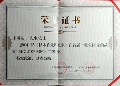 也正是宋雨霜的作品透过小说主人公的经历隐喻家的文化——相互陪伴,理解和懂得,在坚毅的奋斗中又保持杉木般的芬芳,她的作品从诸多作品中脱颖而出,获得二等奖。