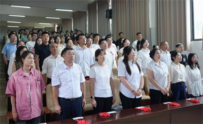 全体与会教职工和学校领导起立奏唱国歌,展现了全校教职工昂扬向上的精神风貌。