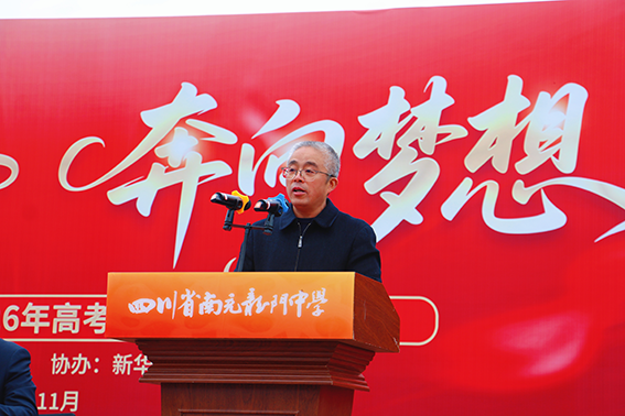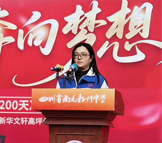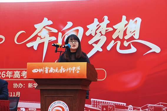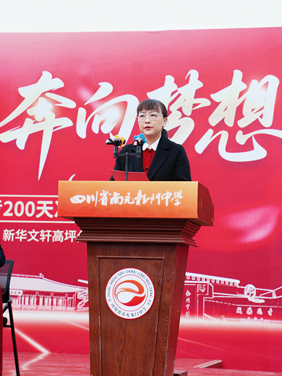 执行校长张莉梅作动员讲话。她以嘉陵江奔流不息的涛声与“小鲤鱼跳龙门”的励志传说为引,回溯学校九十三载文脉传承,讲述杰出校友的奋斗故事,激励同学们汲取文化力量与榜样精神。她向2026届学子提出了三点希望:一是坚定“鱼跃龙门”的必胜信念;二是磨砺“逆流而上”的坚强意志;三是掌握“蓄势聚力”的科学方法。她勉励与鞭策同学们在最后的200天里全力以赴,奋力书写人生华章。